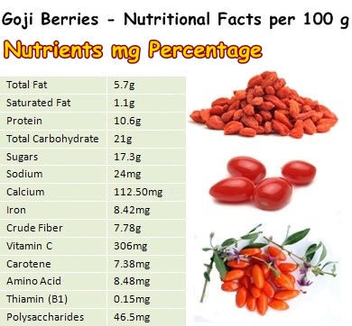 Z nutričného hľadiska sú Goji dosť možno tým najhodnotnejším ovocím na planéte. Obsahujú 18 druhov aminokyselín, vrátane všetkých osem esenciálnych (napr. tryptofan či isoleucín), až 21 stopových prvkov (menujme napríklad zinok, železo, meď, vápnik, germánium, selén a fosfor). Sú jedným z najbohatších zdrojov karotenoidov zo všetkých známych plodov na Zemi, pričom sú výdatnejšie ako mrkva. Ďalej obsahujú vitamíny C, B1, B2, B6 a E. Musíme spomenúť tiež beta-sitosterol. Tento rastlinný sterol sa dnes využíva pri podpornej liečbe zvýšenej hladiny cholesterolu, ďalej pri problémoch s prostatou a má tiež protizápalový účinok.